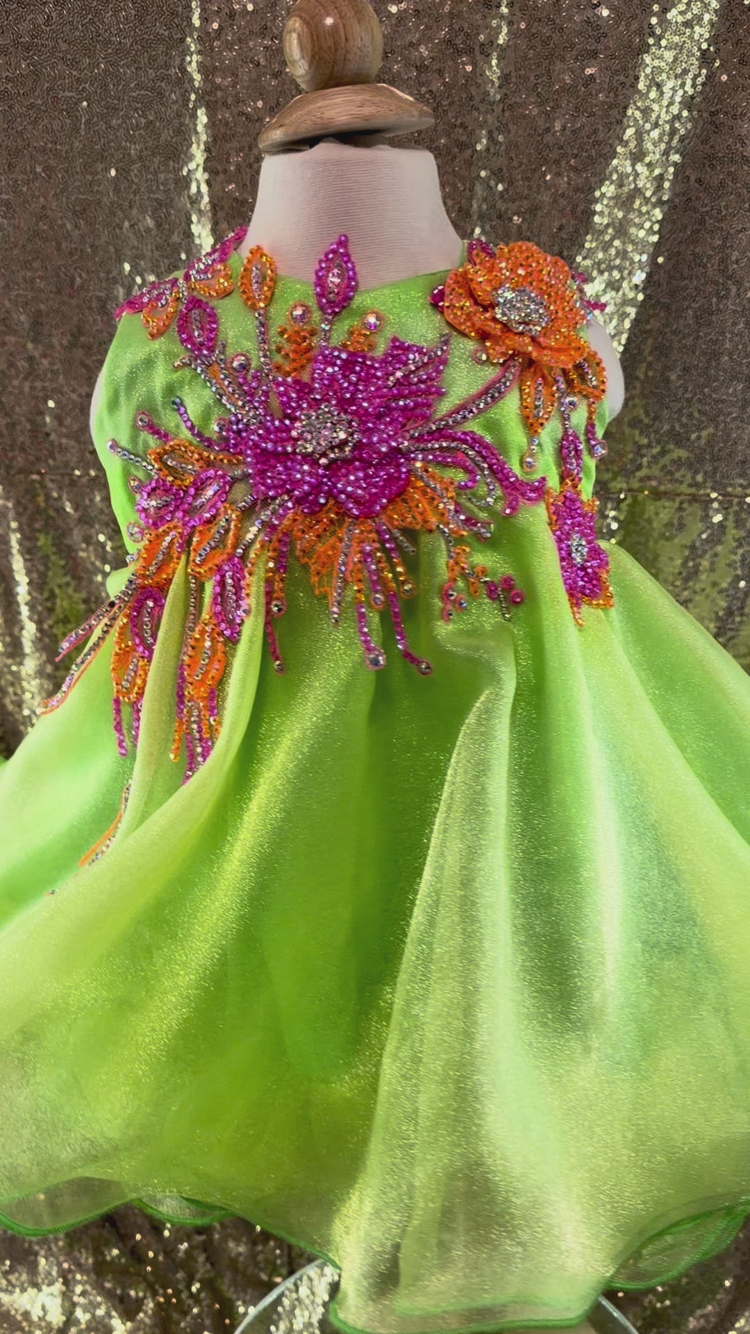 Ignite the stage in Neon Butterfly Blaze, a vibrant neon pageant dress designed to shine from every angle. Featuring bold fuchsia pink and fiery orange glitz, this high-impact look captures the light beautifully—both on stage and even off it.