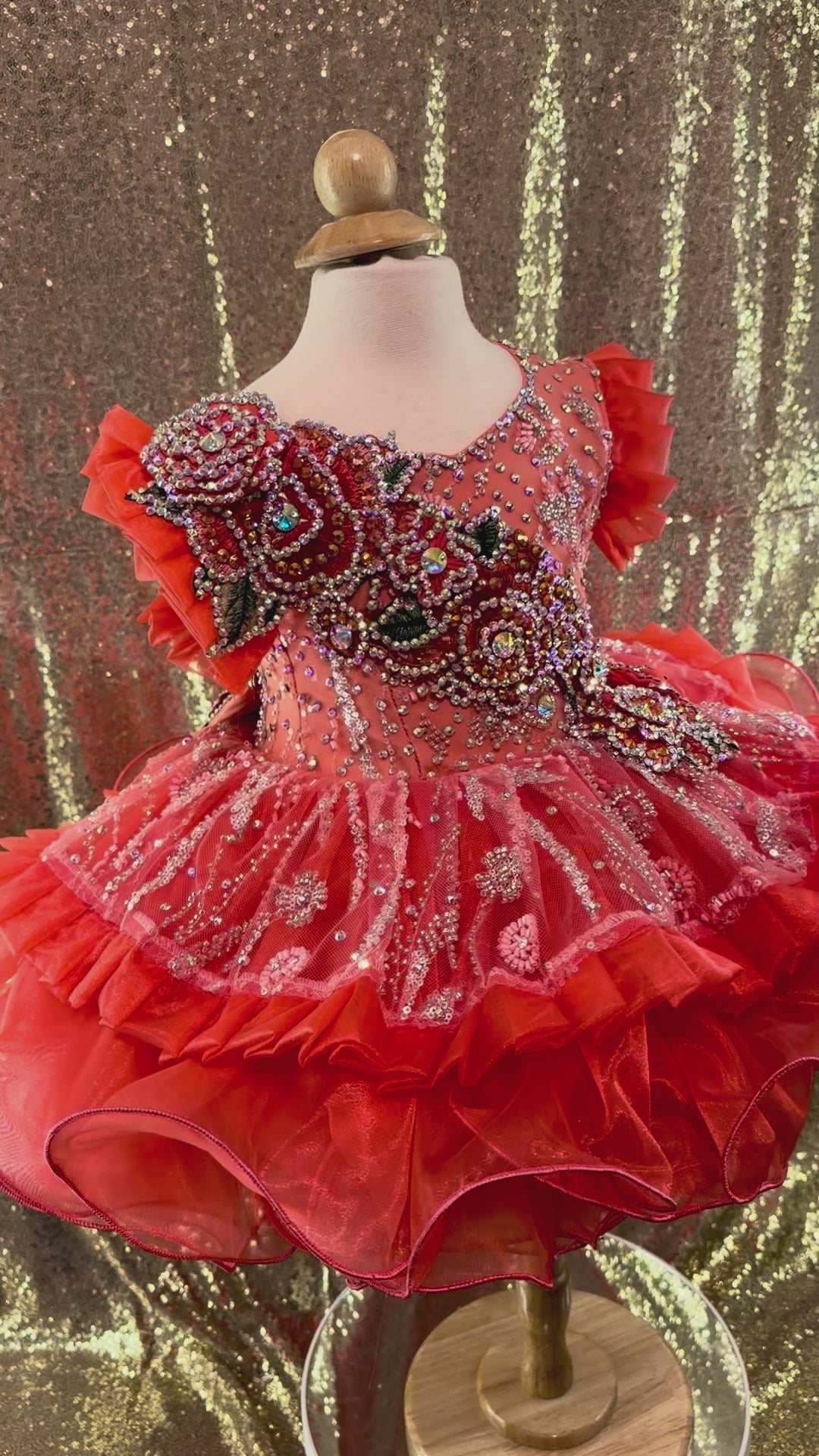 Enhanced with deep coral tones, vibrant green accents, and mega glitz throughout, this gown creates a bold yet elegant color story that shines brilliantly under competition lighting. Every detail works together to deliver movement, sparkle, and unforgettable stage presence.